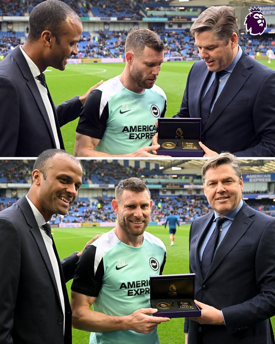 在美国运通球场,全场球迷的注视下,米尔纳在开球前走上场地中央。英超联盟首席执行官理查德-马斯特斯以及英格兰职业足球运动员协会首席执行官马赫塔-莫兰戈共同为他颁发纪念奖杯,祝贺他创造这一载入史册的里程碑。