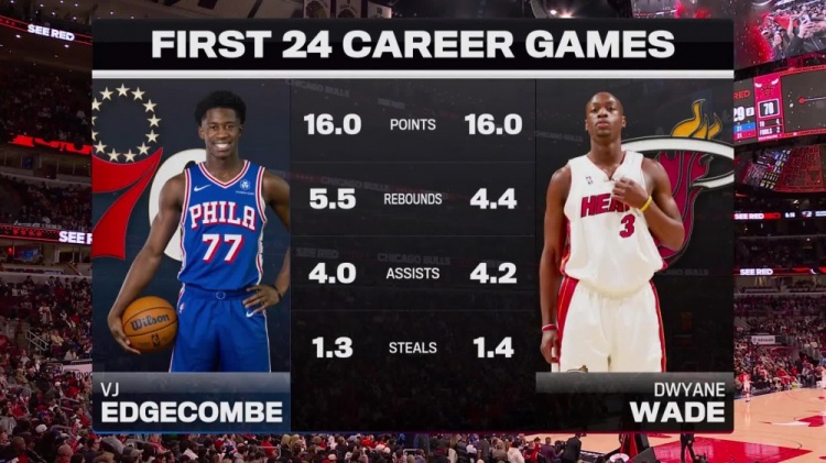 天天赢球-生涯前24战场均数据:埃奇库姆16+5.5+4+1.3 韦德16+4.4+4.2+1.4